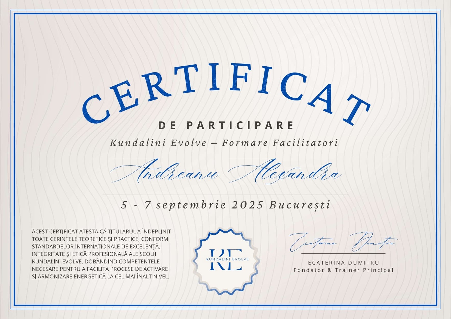 M-am format în cadrul școlii Kundalini Evolve, o metodă care sprijină trezirea energiei vitale prin prezență, conștiență și siguranță. Experiența personală cu această energie a adus în viața mea mai multă claritate, sensibilitate și conexiune cu esența ființei mele, iar acum ghidez cu recunoștință și blândețe alte persoane în propriul lor proces.